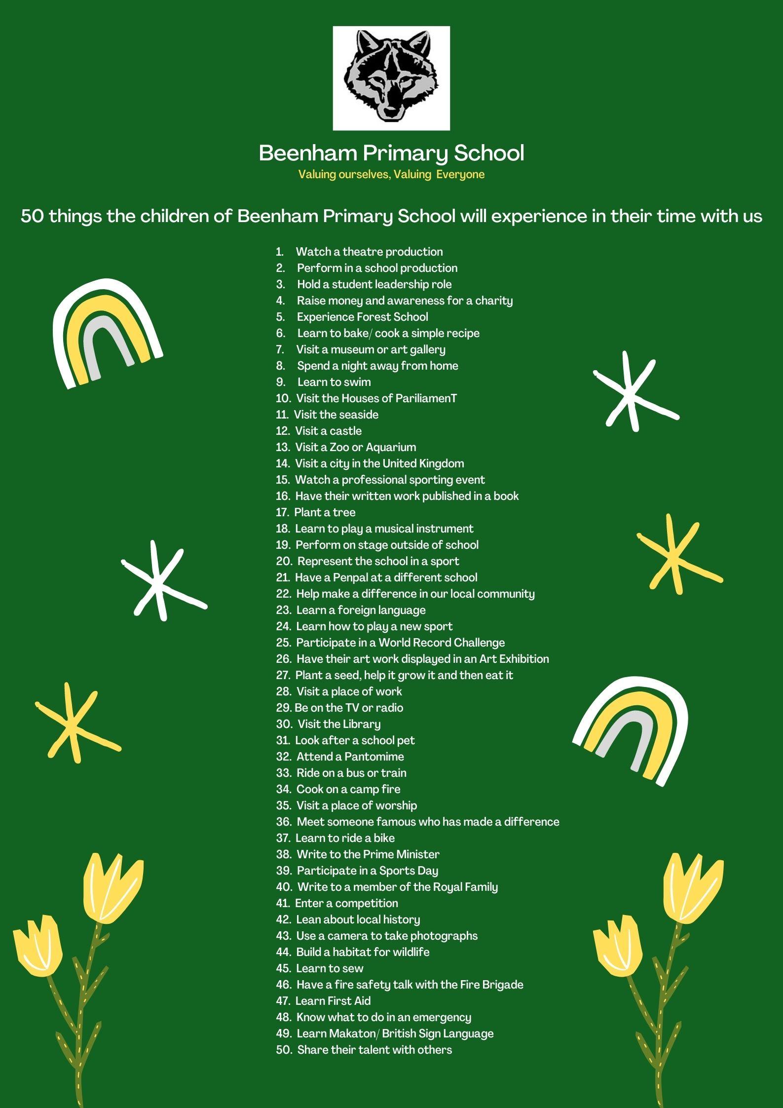 As a wider school community, we decided on 50 things we want our children to experience before they leave us for the next chapter in their education journey.