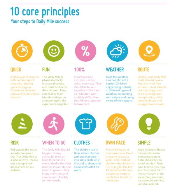 The Daily Mile is simple and free. We want to ensure our children are fit for life and fit for learning by encouraging them to run or jog for 15 minutes every day. It is a physical activity which promotes social, emotional and mental health and wellbeing, as well as fitness. It takes place outside, on our field  in the fresh air during the school day. Children run in their school clothes and trainers.