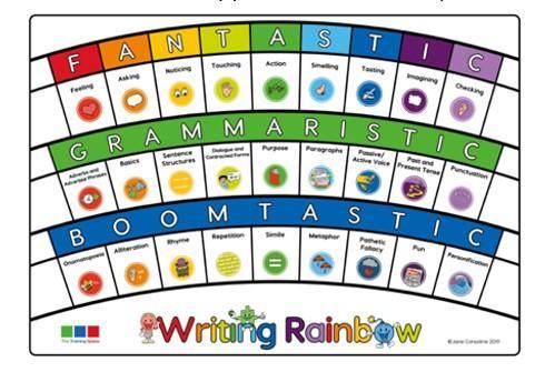 The Writing Rainbow is a concept used in each lesson to aid writing by focusing children on different aspects of writing using “lenses”. It is divided into three layers and on each layer, there are nine different lenses. Teachers select a range of lenses each lesson to support the skill they are teaching.
