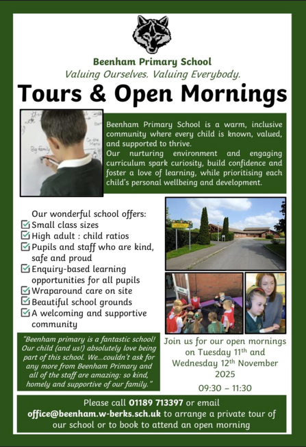 Should you wish to visit the school before making an application to West Berkshire council for a school place, please contact the office to make an appointment.